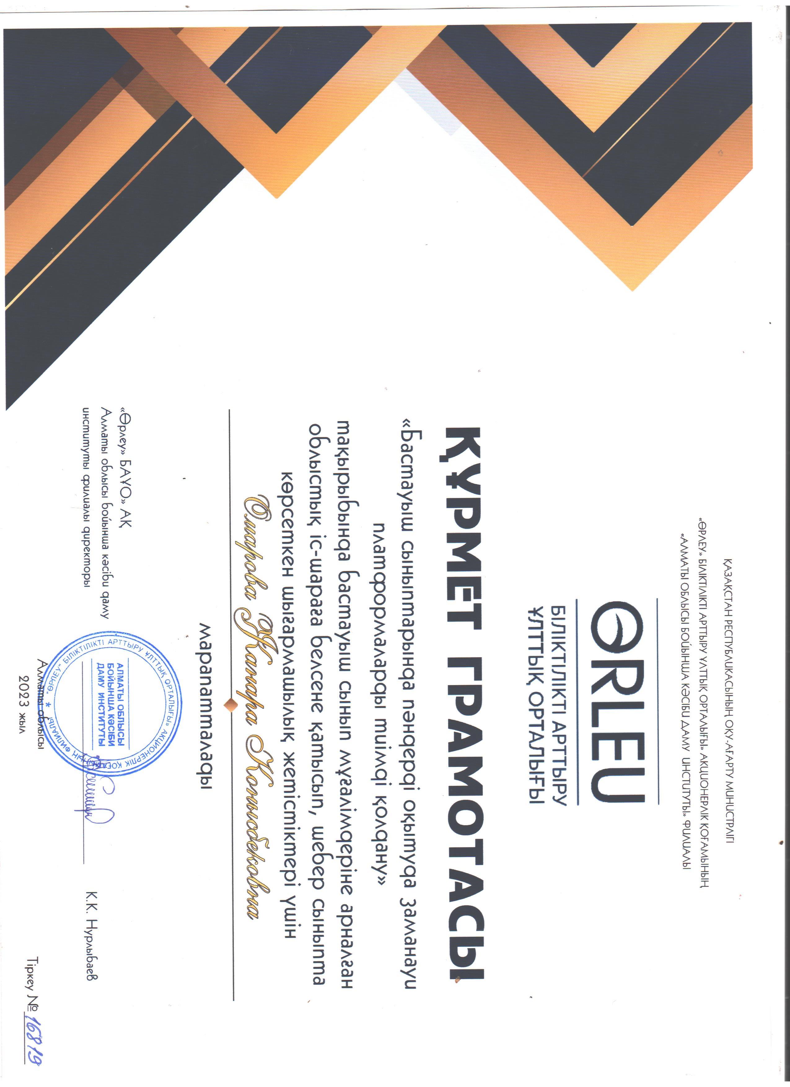 "Бастауыш сыныптарында пәндерді оқытуда заманауи платформаларды қолдану" тақырыбында бастауыш сынып мұғалімдеріне арналған облыстық іс-шараға белсене қатысып, шебер сыныпта көрсеткен шығармашылық жетістіктері үшін бастауыш сынып мұғалімі Омарова