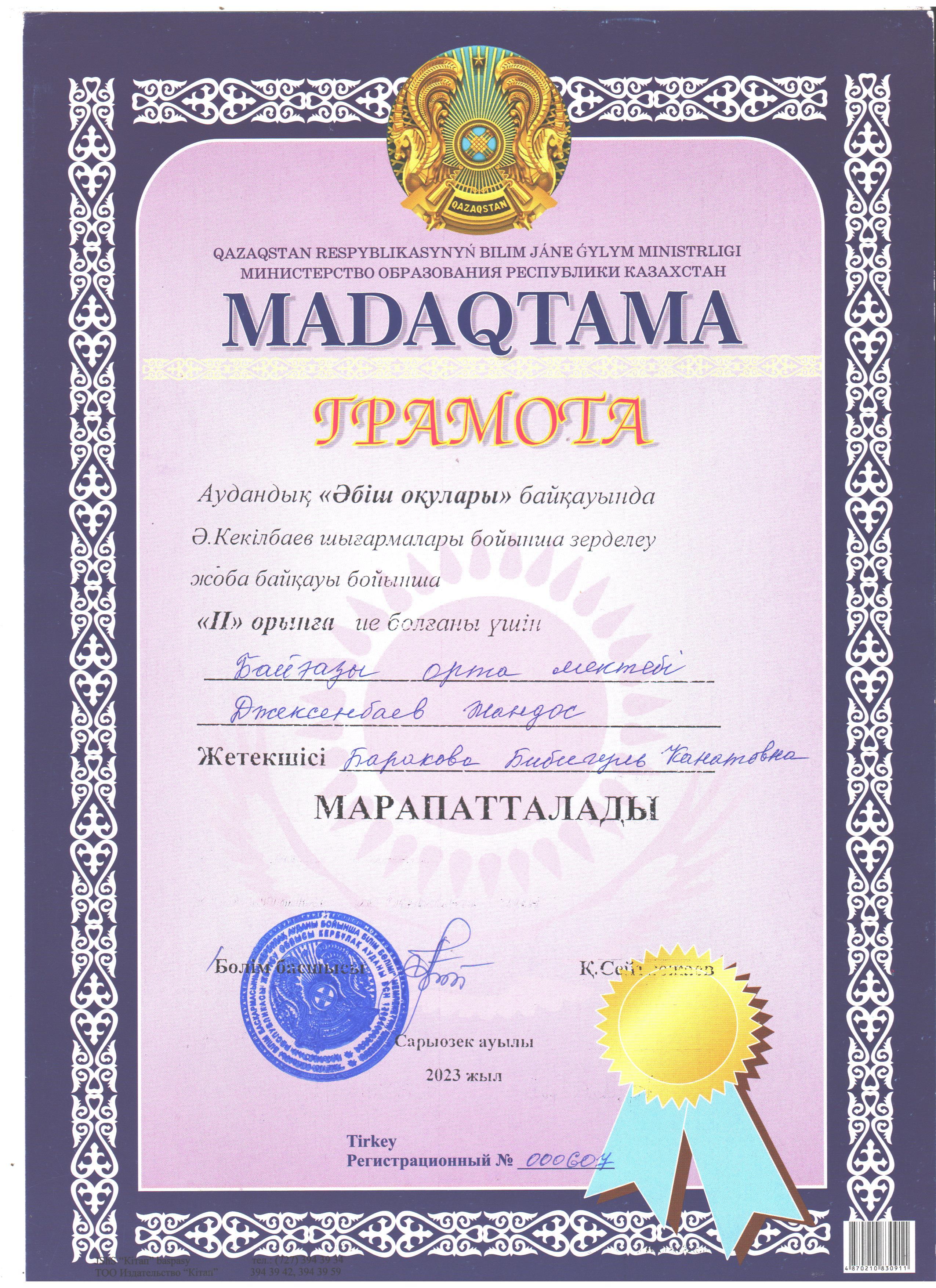 03 февраль 2023 0 1 2 3 4 5 Аудандық «Әбіш оқулары» байқауында Әбіш Кекілбаев шығармалары бойынша зерделеу жоба байқауы бойынша 2 орын Джексенбаев Ж