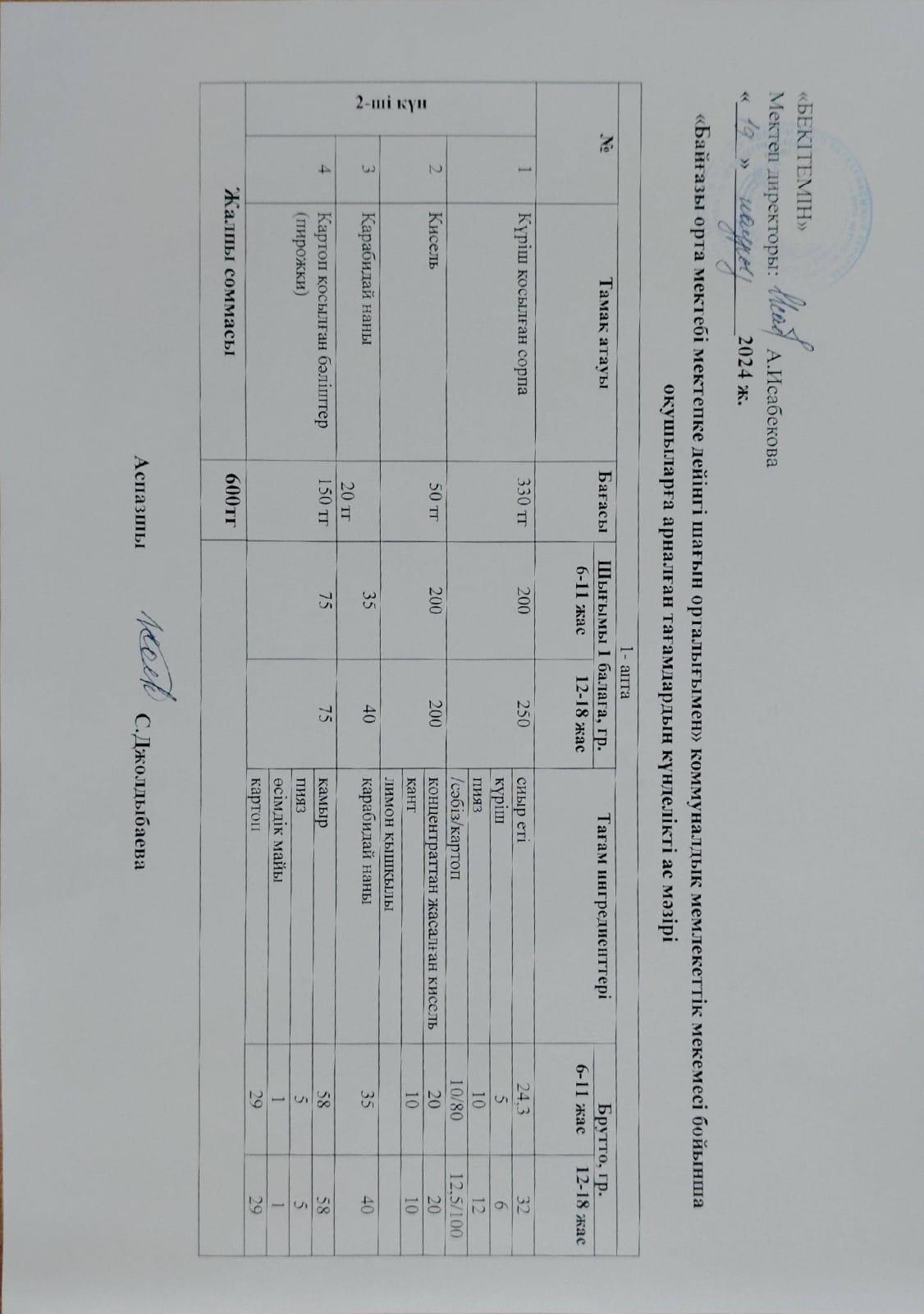 Күнделікті ас мәзірі » Жетісу облысы Кербұлақ ауданы Байғазы орта мектебі