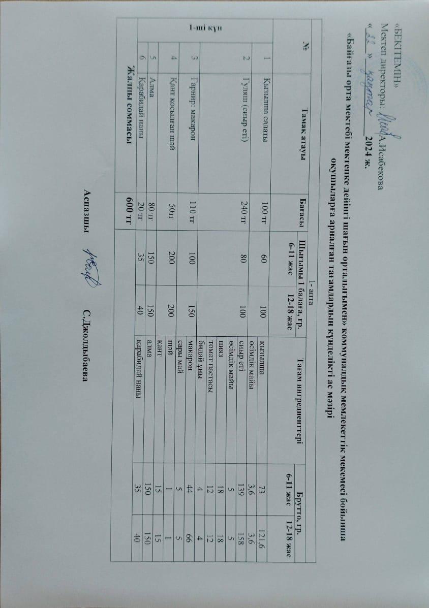 Күнделікті ас мәзірі » Жетісу облысы Кербұлақ ауданы Байғазы орта мектебі