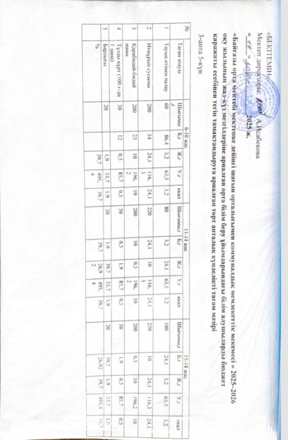 Күнделікті ас мәзірі » Жетісу облысы Кербұлақ ауданы Байғазы орта мектебі