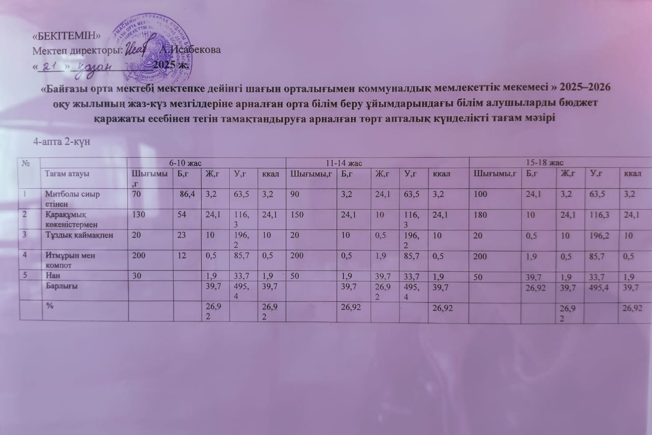 Күнделікті ас мәзірі » Жетісу облысы Кербұлақ ауданы Байғазы орта мектебі