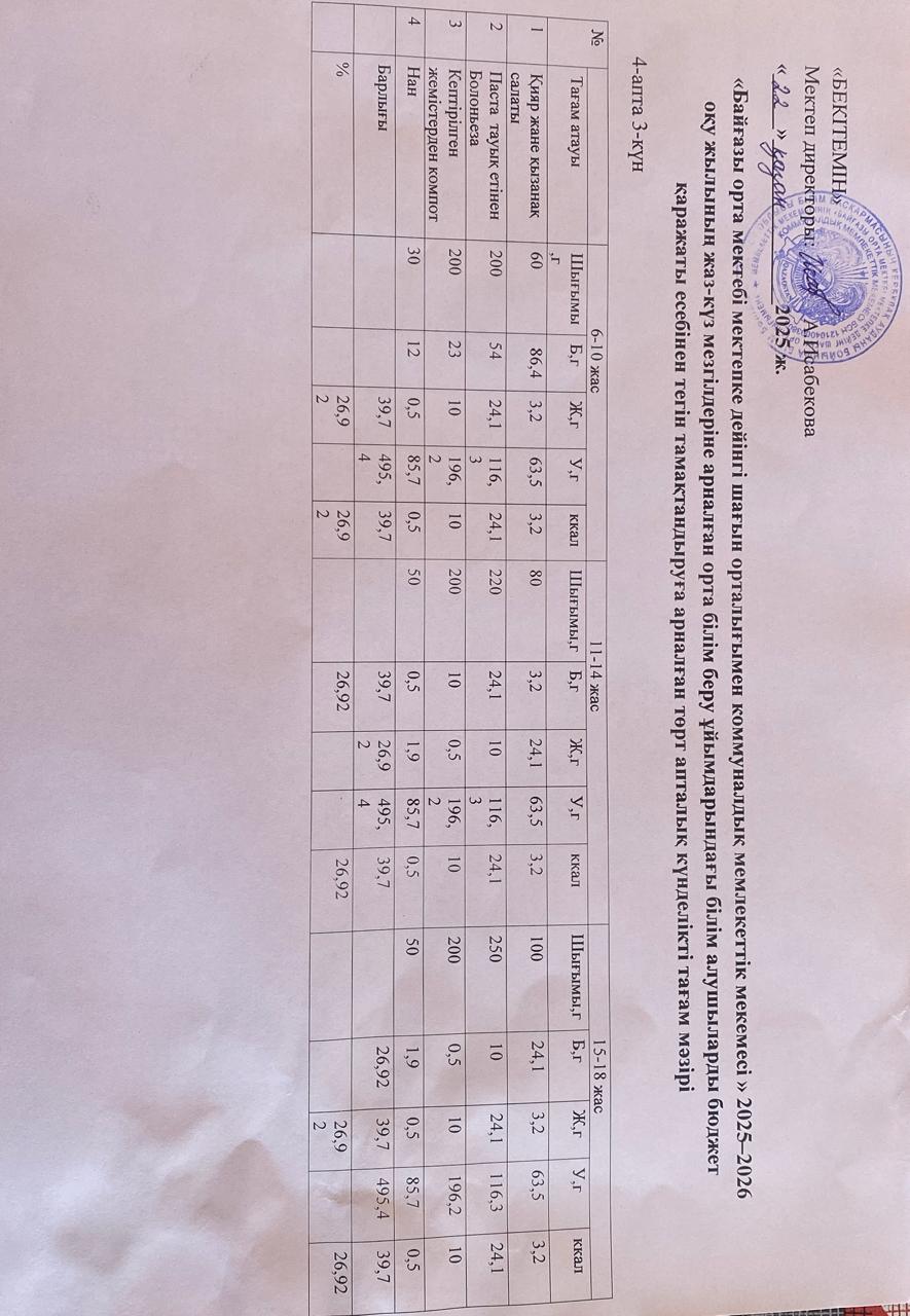 Күнделікті ас мәзірі » Жетісу облысы Кербұлақ ауданы Байғазы орта мектебі